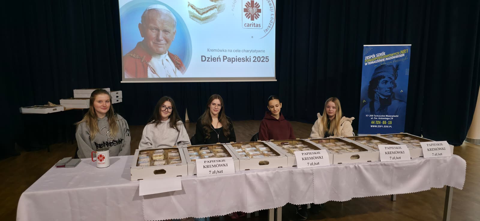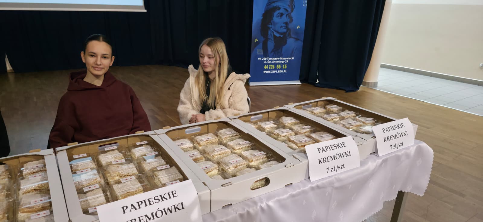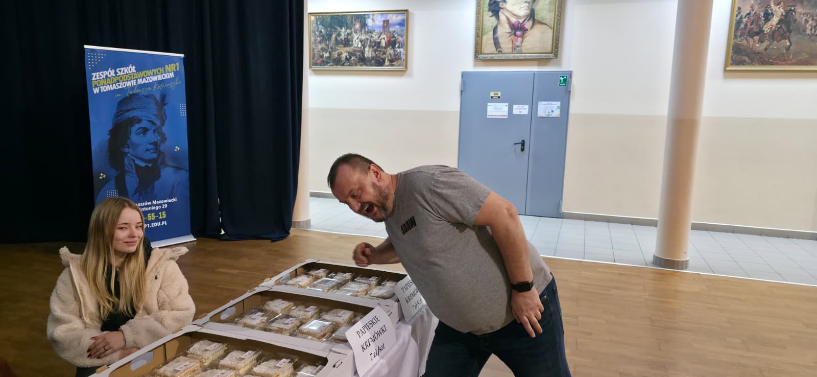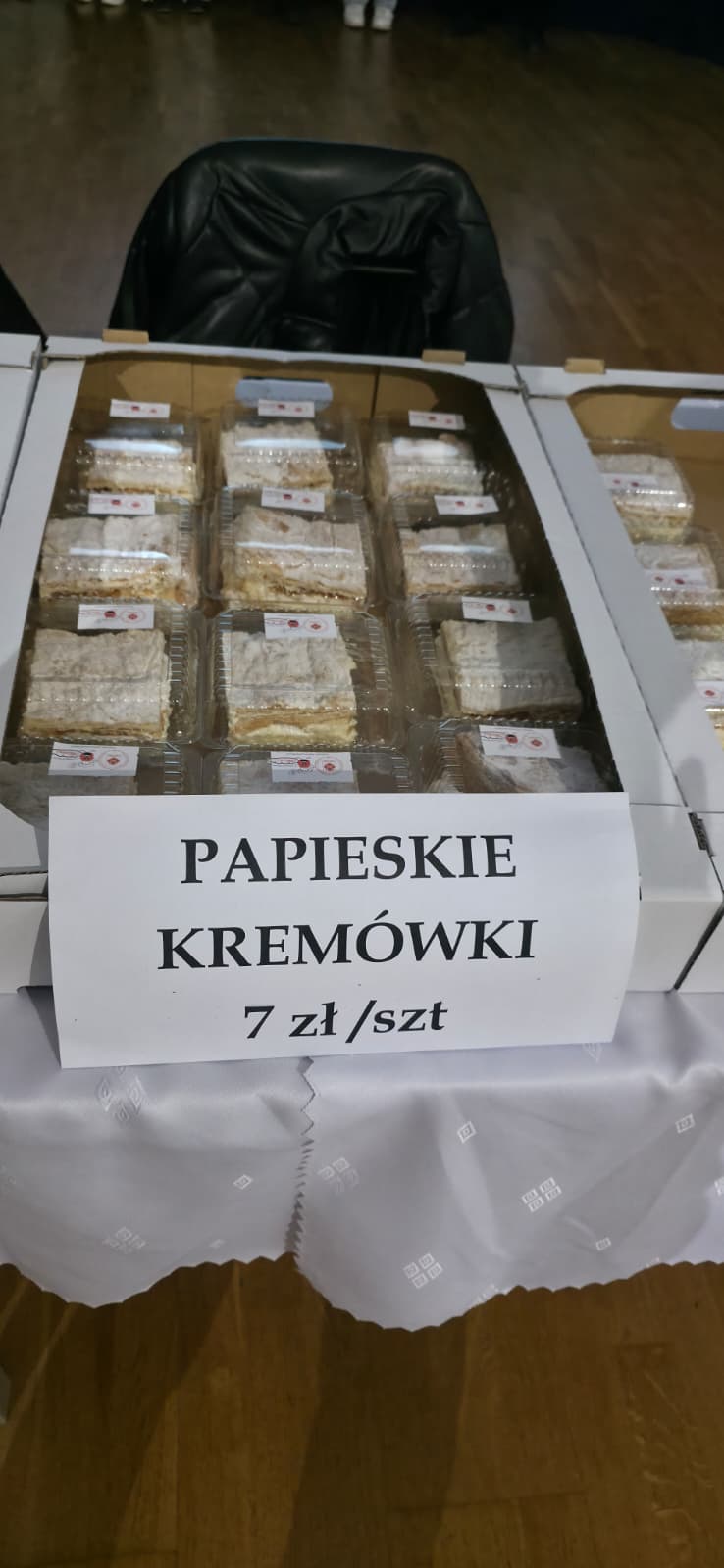 Uczniowie klasy 4H, wraz z ks. Konradem Sulmirskim - opiekunem Koła - sprzedawali tego dnia kremówki, z których dochód przeznaczony zostanie w całości na działalność dobroczynną prowadzoną w naszej Szkole przez wolontariuszy należących do SKC.