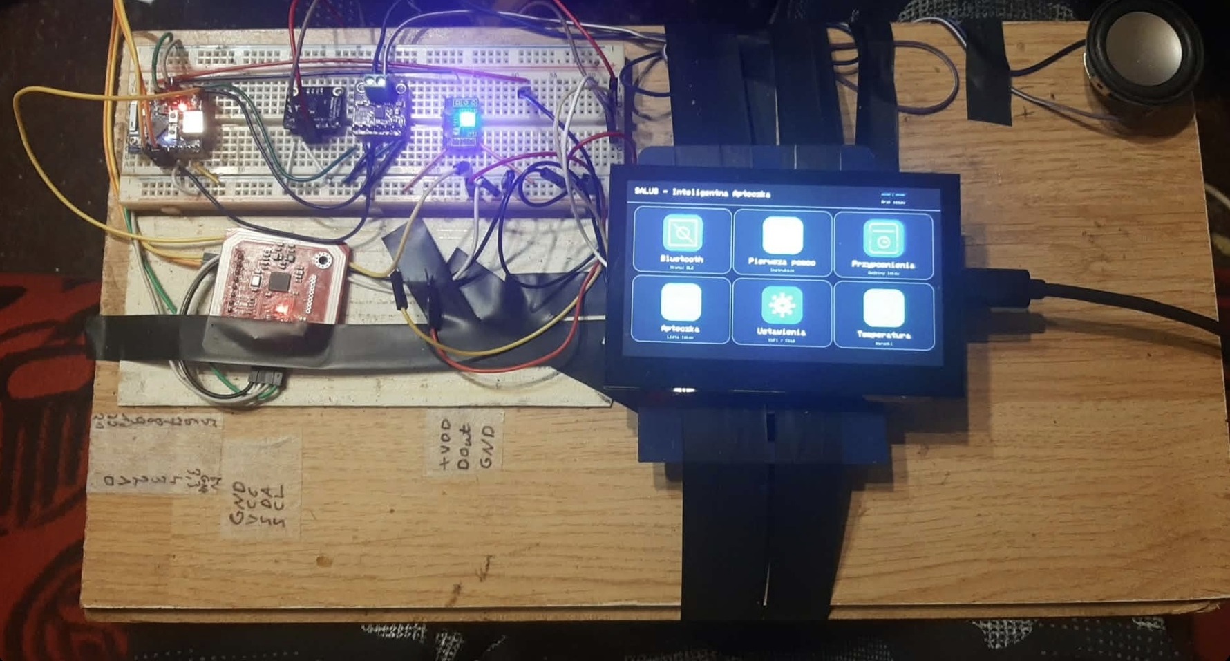 Sercem projektu jest inteligentna apteczka oparta na module ESP32-S3-LCD-4.3, który pełni funkcję głównego ekranu i centrum sterowania. Dodatkowo wiele podzespołów współpracuje z ESP32 Mini, dzięki czemu możliwe było rozbudowanie urządzenia o kolejne praktyczne funkcje.