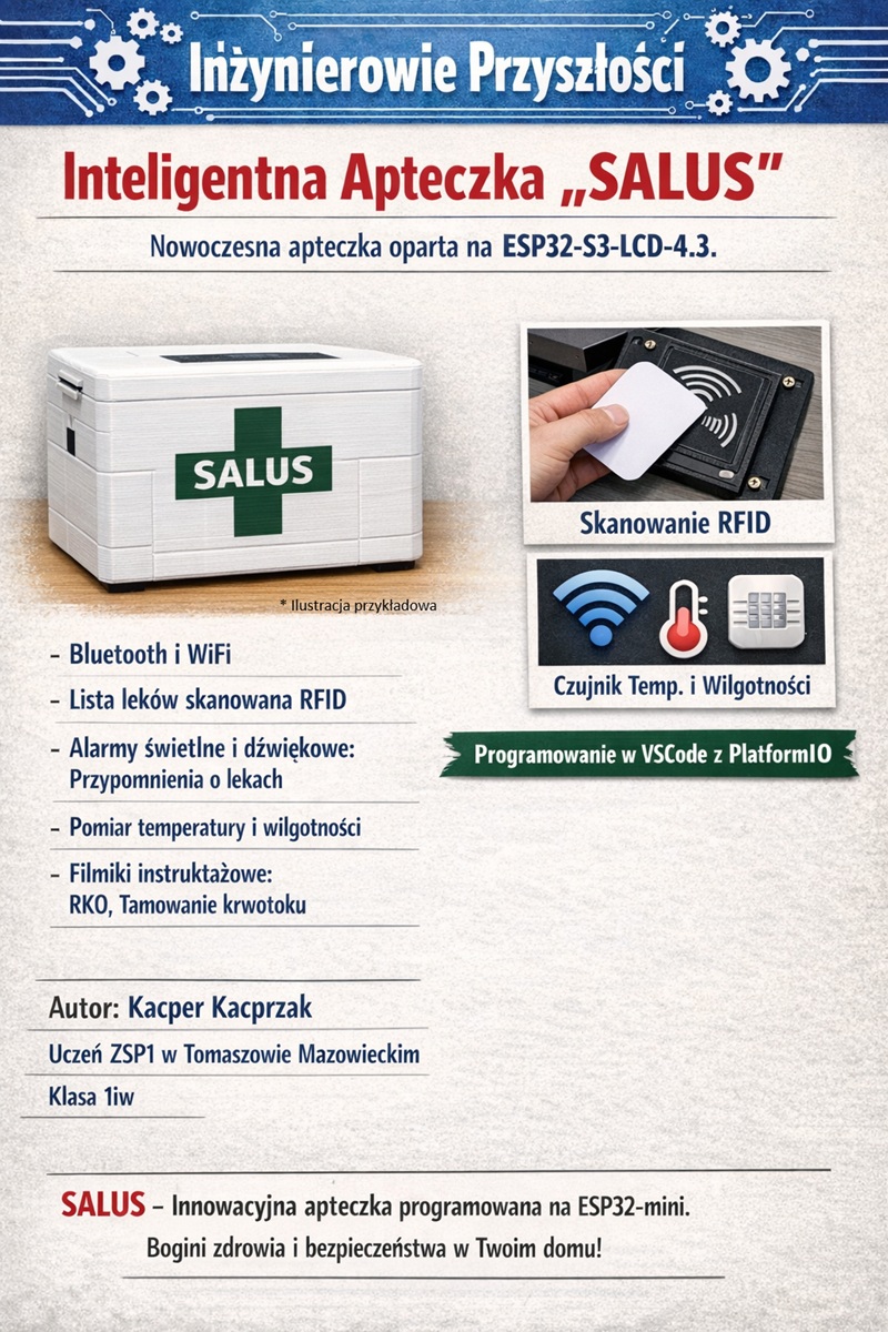 Nowoczesne technologie coraz częściej służą nie tylko rozrywce, ale również zdrowiu i bezpieczeństwu. Przykładem takiego rozwiązania jest projekt SALUS – inteligentna apteczka stworzona przez Kacpra Kacprzaka, ucznia klasy 1iw w Zespole Szkół Ponadpodstawowych nr 1 w Tomaszowie Mazowieckim, przygotowany w ramach programu „Inżynierowie Przyszłości”.